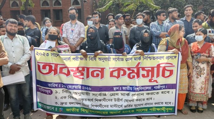 গাজীপুরে ২০২৩ সালের অনার্স পরীক্ষার ফলাফলে বিধি মোতাবেক সর্বোচ্চ গ্রেস মার্ক নির্ধারণসহ তিন দফা দাবিতে উত্তাল হয়ে উঠেছে জাতীয় বিশ্ববিদ্যালয় ক্যাম্পাস। সোমবার (১৬ ফেব্রুয়ারি) সকালে read more