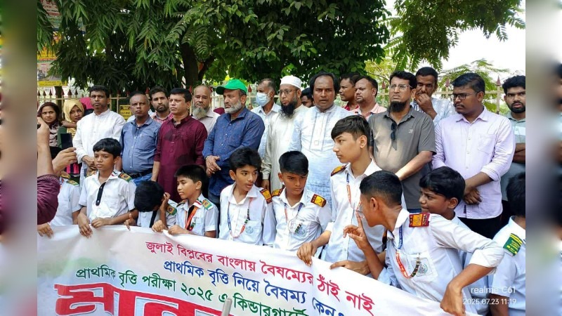 আসন্ন বৃত্তি পরীক্ষায় অংশগ্রহণের দাবিতে বিভিন্ন কিন্ডারগার্টেন স্কুলের বিপুল সংখ্যক ছাত্রছাত্রী অংশগ্রহণ করে। এ সময় পঞ্চম শ্রেণিতে অধ্যয়ণরত শিক্ষার্থী হুমায়রা জানায়, আমি এই দেশের সন্তান আমি বৃত্তি পরীক্ষায় অংশগ্রহণ করতে চাই। বৈষম্যহীন বাংলাদেশে আমি বৈষম্য মেনে নেব না। এ সময় ছাত্রছাত্রীদের হাতে বৃত্তি পরীক্ষায় অংশগ্রহণের দাবির প্লাকার্ড দেখা যায়। মানববন্ধনে উল্লেখযোগ্য অভিভাবকের উপস্থিতি লক্ষ করা গেছে। মানববন্ধন শেষে শিক্ষার্থীরা জেলা প্রশাসকের প্রধান ফটকে বৈষম্যবিরোধী স্লোগান দেয়।