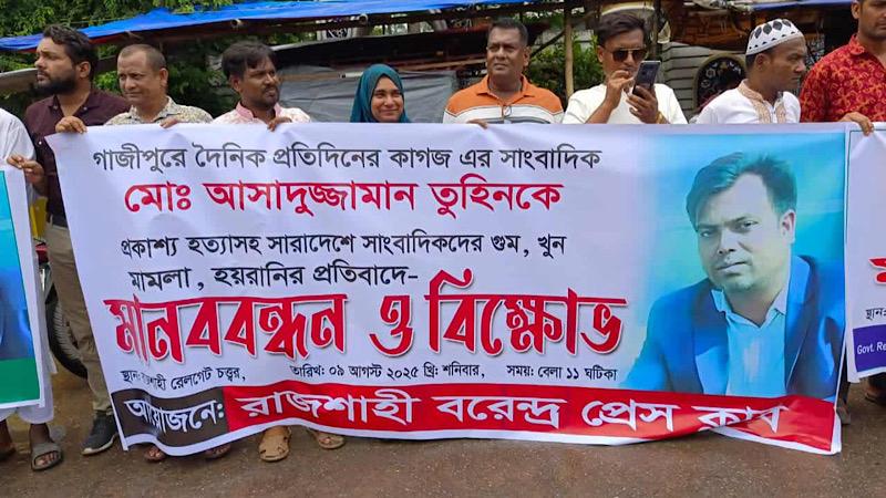 শনিবার বেলা ১১টায় নগরীর রেলগেট চত্ত্বরে রাজশাহী বরেন্দ্র প্রেসক্লাবের উদ্যোগে প্রথম মানববন্ধন কর্মসূচি হয়। এতে রাজশাহী বিভাগীয় প্রেসক্লাব, রাজশাহী অনলাইন সাংবাদিক ফোরাম, বাংলাদেশ সাংবাদিক সংস্থা ও জাতীয় সাংবাদিক সংস্থার ব্যানারে শতাধিক সাংবাদিক অংশ নেন। মানববন্ধন শেষে বিক্ষোভ মিছিল বের হয়। বিক্ষোভ মিছিলটি রেলগেট থেকে নিউমার্কেট হয়ে নগরীর জিরোপয়েন্টে গিয়ে শেষ হয়।দুপুর ১২ টায় রাজশাহী প্রেসক্লাবের উদ্যোগে সাহেব বাজার জিরো পয়েন্টে দ্বিতীয় মানববন্ধন অনুষ্ঠিত হয়। সেখানে রাজশাহী প্রেসক্লাবের সঙ্গে একাত্মতা ঘোষণা করেন রাজশাহী বরেন্দ্র প্রেসক্লাব, রাজশাহী বিভাগীয় প্রেসক্লাব, অনলাইন সাংবাদিক ফোরাম, বাংলাদেশ সাংবাদিক সংস্থা ও জাতীয় সাংবাদিক সংস্থা। এছাড়াও রাজশাহীর সিনিয়র সাংবাদিকরা উক্ত মানববন্ধনে অংশ নেয়।