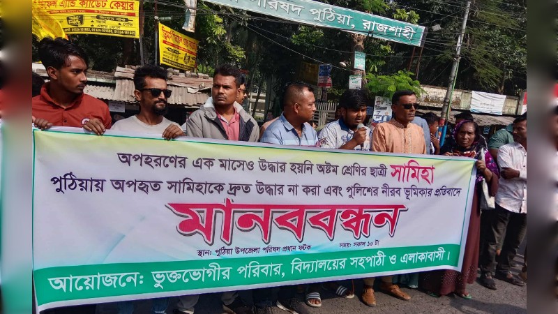 মঙ্গলবার (২৫ নভেম্বর), সকাল ১১টায় রাজশাহী-ঢাকা মহাসড়কের পুঠিয়া উপজেলা পরিষদেধের গেটের সামনে সামিহার পরিবারের পাশে দাঁড়িয়ে এলাকাবাসী প্রায় এক ঘন্টা দাড়িয়ে মানববন্ধন কর্মসূচি পালন করেছে। তারা অভিযোগ করেন, মামলার পরও আইনশৃঙ্খলা বাহিনীর কার্যকর উদ্যোগের অভাবে এখনো সামিহাকে উদ্ধার করা যায়নি।