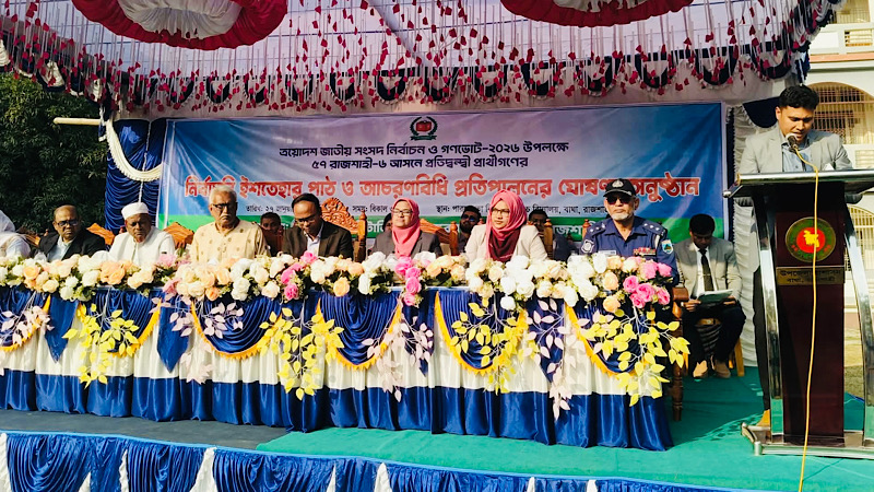 রাজশাহী-৬ (চারঘাট-বাঘা) আসনে ত্রয়োদশ জাতীয় সংসদ নির্বাচন ও গণভোট ২০২৬-কে কেন্দ্র করে প্রতিদ্বন্দ্বী প্রার্থীদের অংশগ্রহণে এক বিশেষ নির্বাচনী ইশতেহার পাঠ অনুষ্ঠান সম্পন্ন হয়েছে। মঙ্গলবার (২৭ জানুয়ারি) দুপুরে চারঘাটের পারসাওতা বিনোদপুর উচ্চ বিদ্যালয় মাঠে আয়োজিত এই অনুষ্ঠানে সভাপতিত্ব করেন সহকারী রিটার্নিং কর্মকর্তা ও উপজেলা নির্বাহী কর্মকর্তা শাম্মী আক্তার। গণতান্ত্রিক প্রক্রিয়ার অংশ হিসেবে আয়োজিত এই অনুষ্ঠানে নির্বাচনী এলাকার সাধারণ ভোটারদের উপস্থিতিতে প্রার্থীরা তাদের ভবিষ্যৎ কর্মপরিকল্পনা জনগণের সামনে তুলে ধরেন।