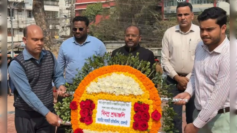 রাজশাহীতে যথাযথ ভাবগাম্ভীর্য ও মর্যাদার মধ্য দিয়ে মহান শহীদ দিবস ও আন্তর্জাতিক মাতৃভাষা দিবস উদযাপিত হয়েছে। দিবসটির তাৎপর্য তুলে ধরে শনিবার বেলা ১১টায় রাজশাহী কেন্দ্রীয় শহীদ মিনারে পুষ্পস্তবক অর্পণের মাধ্যমে ভাষা শহীদদের প্রতি গভীর শ্রদ্ধা নিবেদন করেন ভারতীয় সহকারী হাইকমিশনার মনোজ কুমার। শ্রদ্ধা নিবেদনকালে তাঁর সঙ্গে দূতাবাসের অন্যান্য পদস্থ কর্মকর্তারা উপস্থিত ছিলেন।
