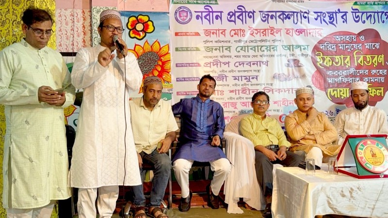 গাজীপুর মহানগরীর ৩৮ নং ওয়ার্ডের সোয়াদ কমিউনিটি সেন্টারে স্বেচ্ছাসেবী ও সামাজিক সংগঠন 'নবীন প্রবীণ জনকল্যাণ সংস্থা'–এর উদ্যোগে অসহায় ও দরিদ্র মানুষের মাঝে ইফতার বিতরণ এবং এক ইফতার ও মিলাদ মাহফিল অনুষ্ঠিত হয়েছে। অনুষ্ঠানে প্রধান অতিথি হিসেবে উপস্থিত ছিলেন গাজীপুর মেট্রোপলিটন পুলিশের (জিএমপি) কমিশনার মো. ইসরাইল হাওলাদার। প্রধান অতিথির বক্তব্যে তিনি বলেন, নবীন প্রবীণ জনকল্যাণ সংস্থা তাদের মানবিক ও সামাজিক কার্যক্রমের মাধ্যমে সমাজে এক ইতিবাচক ভূমিকা রাখছে। অসহায় ও দুঃস্থ মানুষের পাশে দাঁড়িয়ে তারা যে দৃষ্টান্ত স্থাপন করেছে, তা সত্যিই প্রশংসনীয়। সমাজের বিত্তবান ও অন্যান্য সামাজিক সংগঠনগুলোকেও এ ধরনের মানবিক কর্মকাণ্ডে এগিয়ে আসার উদাত্ত আহ্বান জানান তিনি।