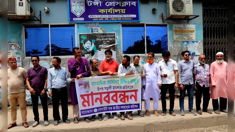 গাজীপুরে ঢাকা প্রেসক্লাবের সাধারণ সম্পাদক মোসলেহ উদ্দিন বাচ্চুর ওপর বর্বরোচিত ও নৃশংস হামলার প্রতিবাদে ফুঁসে উঠেছে স্থানীয় সাংবাদিক সমাজ। আজ রোববার সকাল ১১টায় টঙ্গী প্রেসক্লাবের সামনে সোসাইটি অব জাতীয় গণমাধ্যম কমিশনের উদ্যোগে আয়োজিত এক বিশাল মানববন্ধনে গণমাধ্যমকর্মীরা প্রশাসনের প্রতি তীব্র ক্ষোভ ও নিন্দা প্রকাশ করেন। সমাবেশ থেকে হামলাকারীদের আগামী ২৪ ঘণ্টার মধ্যে গ্রেপ্তারের আল্টিমেটাম দেওয়া হয়েছে। অন্যথায় দেশজুড়ে কঠোর আন্দোলনের হুঁশিয়ারি দিয়েছেন সাংবাদিক নেতারা।