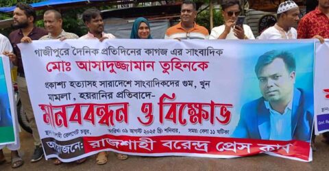 আবুল হাশেম রাজশাহী ব্যুরোঃ গাজীপুরে ‘প্রতিদিনের কাগজ’ পত্রিকার সাংবাদিক মো. আসাদুজ্জামান তুহিন হ’ত্যা ও বাংলাদেশের আলো পত্রিকার আনোয়ার হোসেনের উপর হামলা নির্যাতনের প্রতিবাদে রাজশাহীতে দুই স্থানে মানববন্ধন ও বিক্ষোভ মিছিল