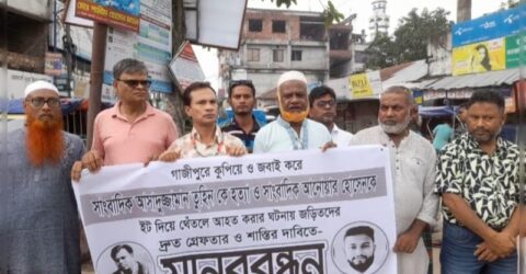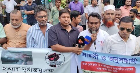 নিজস্ব প্রতিবেদক: গাজীপুরে সাংবাদিক আসাদুজ্জামান তুহিনকে কুপিয়ে হ’ত্যার প্রতিবাদে মানববন্ধন ও বিক্ষোভ সমাবেশ করেছে স্থানীয় গণমাধ্যমকর্মীরা। শনিবার (৯ আগস্ট) বিকেল ৪টায় নগরীর বোর্ডবাজার ঢাকা–ময়মনসিংহ মহাসড়কে এ কর্মসূচি অনুষ্ঠিত হয়। বাংলাদেশ